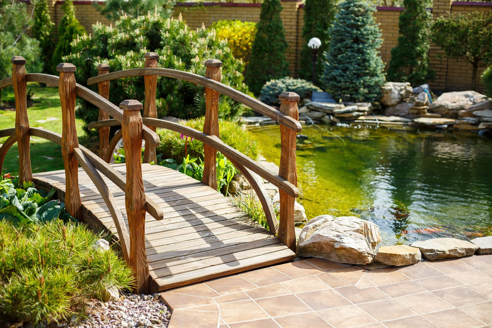Wooden garden bridges are commonly used in backyard landscapes. Their natural texture blends well with plants and water features. These bridges are often placed over small ponds or decorative streams. The simple design adds charm without overpowering the surrounding landscape. Wooden bridges can also be painted or polished to match the garden theme. This makes them versatile for different garden styles.