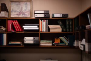Storage solutions such as shelves, cabinets, or drawers help keep the home office organized. Wall shelves are especially useful for storing books, documents, and decorative items. Keeping the workspace clean and clutter-free improves focus and efficiency. Many modern offices also include small storage units that match the desk or furniture style. Organized storage systems help maintain a neat and professional working environment.