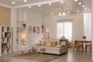 Lighting plays an important role in living room renovation. Floor lamps, ceiling lights, and accent lighting can improve the mood of the room. Proper lighting highlights decorative elements and makes the space feel warmer. Well-designed lighting also improves visibility for daily activities.