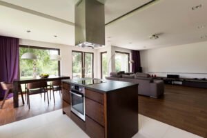 In many modern homes, the kitchen is integrated with the living and dining areas. Kitchen islands or breakfast counters often act as a divider between spaces while still maintaining an open feel. This design allows people to cook while interacting with family members or guests. Stylish cabinets, modern appliances, and good lighting help create a functional and visually appealing open kitchen.