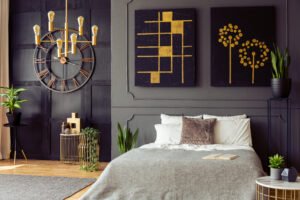 Decorative elements such as curtains, rugs, and wall art add personality and warmth to the bedroom. Soft curtains help control natural light while also improving the visual appeal of the space. Rugs placed near the bed provide comfort underfoot and help define the room’s layout. Wall art, framed photos, or decorative panels can make empty walls more interesting and visually appealing. When these decorative elements are chosen carefully, they help create a balanced and stylish bedroom interior.