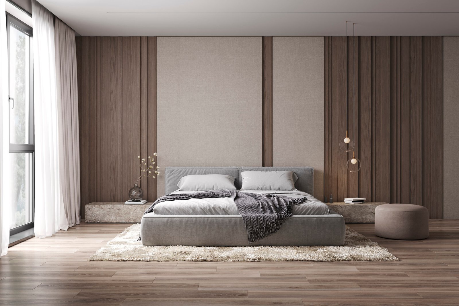 Decorative elements such as curtains, rugs, and wall art add personality and warmth to the bedroom. Soft curtains help control natural light while also improving the visual appeal of the space. Rugs placed near the bed provide comfort underfoot and help define the room’s layout. Wall art, framed photos, or decorative panels can make empty walls more interesting and visually appealing. When these decorative elements are chosen carefully, they help create a balanced and stylish bedroom interior.